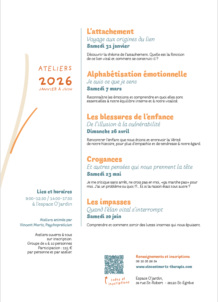 Ouverts à tous, venez découvrir dans la sécurité et l’intimité d’un petit groupe les différentes thématiques qu’il vous propose d’aborder, telles que la théorie de l’attachement, les émotions, les blessures de l’enfance, les croyances…